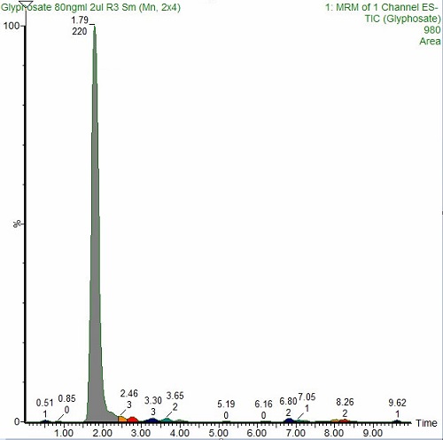 See a screen shot of a typical peak we’re producing from glyphosate standards. This peak shows the area response for a concentration of 80 ng/mL: